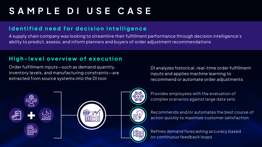 In recent years, the growth in artificial intelligence (AI) has transformed businesses by driving innovation. This growth is only expected to increase with projections indicating that the global AI market will reach $407 billion by 2027. AI’s rapid development is causing a buzz across the economy, most commonly with the increasing popularity of large language models (LLMs) like ChatGPT and Microsoft Copilot. However, another emerging AI trend is gaining immense momentum—decision intelligence (DI). The global DI market size is expected to grow to $26 billion in 2028.