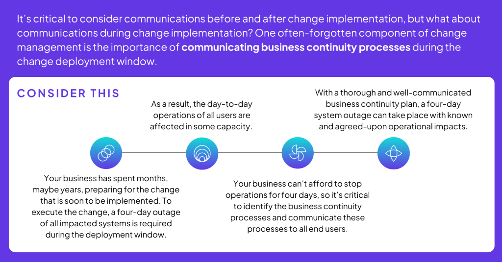 No matter how simple a change may appear to be, you must proactively manage it before employees feel the impact. Communicating with your teams in advance will not only mitigate post-implementation downtime, but will enable people to prepare for a shift in their work environment. A People, Process, Technology (PPT) framework can help you effectively manage the change before, during, and after implementation.
