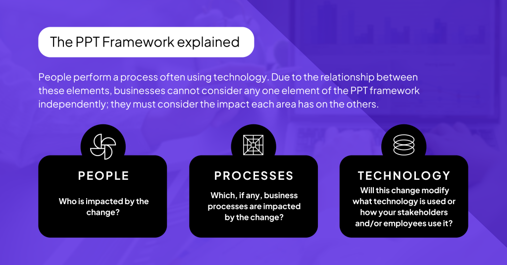 While the PPT framework allows you to identify change impacts at a high level, it’s important to conduct stakeholder and change impact analyses to define the specific effects.