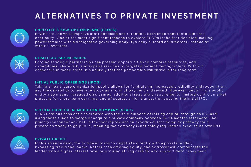 PE has established a presence in the healthcare industry over the past decade. Motivated by an economy with low interest rates, increased commercialization of healthcare, and a “recession-proof” business model, this type of private investment has sought partnerships with primarily physician groups, senior healthcare facilities, and some large hospital systems. While the expertise and resources brought forth by PE are valuable, healthcare providers should familiarize themselves with alternative financing strategies before committing solely to PE as a catalyst for growth.