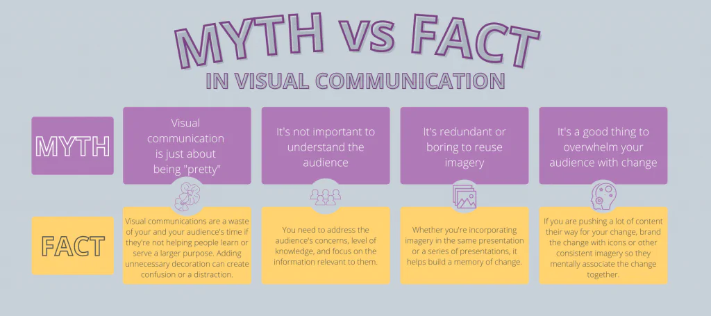 To remediate this, I encourage the use of visual communication to improve project management as a whole. Visual communication — or the use of icons, graphs, and pictures to convey ideas and information — can introduce topics, gain buy-in, and encourage adoption. Using visuals can help us reach our goals of sustainable change.